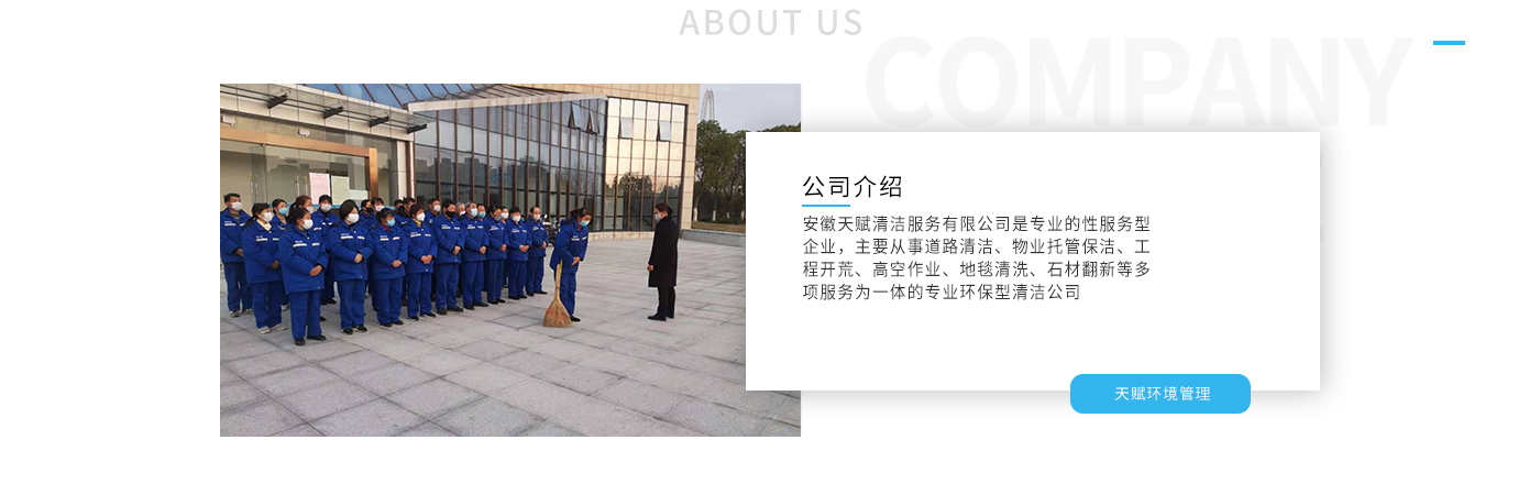 安徽天賦清潔服務(wù)有限公司是的服務(wù)型企業(yè),主要從事道路清潔、物業(yè)托管保潔、工程開荒、高空作業(yè)、地毯清洗、石材翻新等多項服務(wù)為一體的環(huán)保型清潔公司。公司管理機制完善,清潔作業(yè)經(jīng)驗豐富,擁有技術(shù)力量,嚴格實行崗前培訓—崗中督查—上崗在培訓的員工管理措施,憑著優(yōu)良的清潔質(zhì)量和嚴格的督查管理,為眾多企事業(yè)單位、醫(yī)院、酒店、廠區(qū)商場、物業(yè)、道路、學校、公園等提供后勤清潔服務(wù)。在業(yè)內(nèi)擁有良好的口碑。工作人員,服務(wù)態(tài)度優(yōu),竭力為客戶提供好的保潔服務(wù)。安徽天賦清潔服務(wù)有限公司:致力于長期合作關(guān)系,提高服務(wù)質(zhì)量,提供高標準的清潔服務(wù)。公司的經(jīng)營理念:為營造一個更清潔、亮麗的生活和工作環(huán)境而努力!“誠信”是公司成功保證。“客戶至上,信譽為首”是公司宗旨。高標準提供服務(wù),維護客戶利益、形象,是我始終不渝的目標。